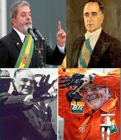 Getúlio fechou o Congresso; o PT subornou o Congresso. Getúlio instalou um Poder Judiciário teleguiado; o PT criou um Poder Judiciário colonizado. Getúlio instituiu o regime em que “para os amigos, (o Estado dava) tudo; para os inimigos, (o Estado aplicava) a lei”; o PT instituiu o sistema dos vazamentos seletivos para a imprensa dos “podres” de seus adversários políticos, verdadeiros ou falsos, de par com as suítes especiais nos presídios para os poucos “amigos” condenados antes da desmontagem do Poder Judiciário. Getúlio criou a indústria de base e a distribuiu entre os “amigos” que financiavam o regime; o PT reverteu a economia democratizada que recebeu na política dos “campeões nacionais” donos de monopólios financiados com dinheiro público, hoje os maiores contribuintes de suas campanhas. Getúlio seduziu o povão com a outorga de direitos sem a contrapartida de deveres; o PT seduziu o povão com os salários sem a contrapartida do trabalho. Getúlio criou os sindicatos pelegos sustentados pelo Estado; Lula e o PT são o produto direto deles.