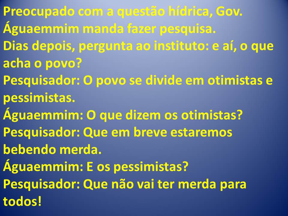 O Governador Aidemin está agindo com a maior competência. A água que irá abastecer os lares paulistas será hidroeletrolítica, fornecendo para toda a população as benécias das bebidas padrão “power”. Será o fim da indústria de isotônicos.